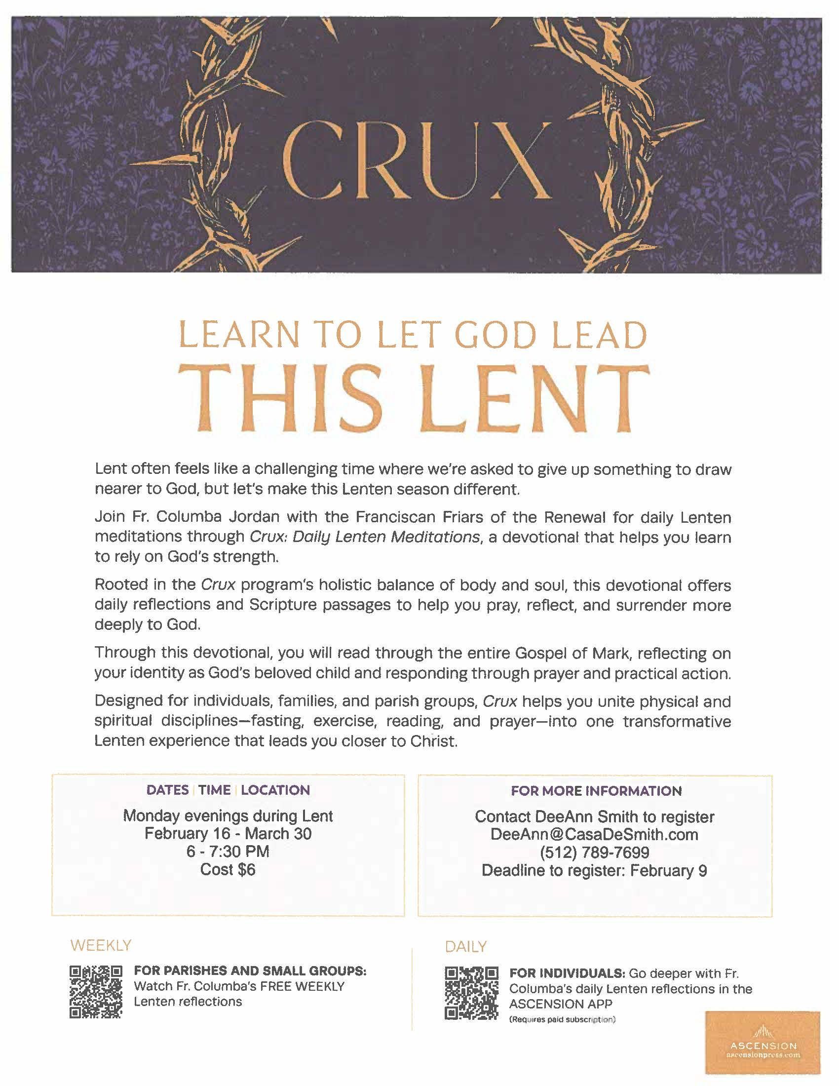 If you need your Tithing Annual Statement for tax season, please call the St. Mary's Office at 512-556-5544 to request your statement. Please give the office at least a week to gather the information and get it to you.